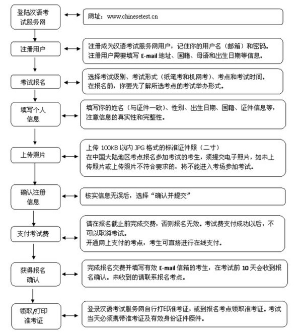 如所选考点未开通网上报名,你可以到考点进行现场报名和交费。 二.考生照片要求关于照片的要求,主要适用于HSK4-6级、HSKK、BCT和YCT口试,其它级别考试成绩报告不印刷照片。照片的准备和使用请按照下面的要求进行:照片样式要求: - 本人近期证件照(标准二寸),不可以是生活照、风景照 - 不允许佩戴帽子、头巾、发带、墨镜(有特殊宗教信仰的除外); - 黑白或彩色照片均可,以白色背景为佳考生登录汉语考试服务网,按照网站指导上传电子照片,或者将电子照片交给考点负责报名的老师,请报名老师协助上传。 三.准考证准考证内容包括考生姓名、国籍、性别、证件类型和号码、考试科目、考试时间、考点名称、考试地点、考场须知等。考生收到准考证后请仔细检查准考证上各项信息是否准确无误。准考证上所填姓名、性别、出生日期及证件号码必须与有效证件一致,否则不得参加考试。如果准考证上信息有误,请联系考点更改,否则考试无效。准考证是考生入场参加考试的重要证明,未携带准考证的考生不得入场参加考试。考试结束以后考生需要继续保存准考证,在领取成绩报告时需要提供准考证。在网上查询成绩和申请额外成绩报告等增值服务时也需要提供准考证号码。 四.更改考试日期考生完成报名和交费后,可以在规定的时间内申请更改考试日期,但不可以取消报名,已经报名的考试地点和考试级别不可以更改。考生需要通过汉语考试服务网(www.chinesetest.cn),登录“个人中心”申请更改考试日期,可更改的考试日期为报名考点当年度举办的任何一次相同级别的考试。更改考试日期的时限与费用如下:• 报名截止前(含报名截止当天):考生可以免费更改考试日期。• 报名截止后到考试前10天(含第10天):考生在此期间申请更改,须事先交纳金额为考试费30%的更改手续费。• 考试前10天以内(不含第10天):不再接受更改申请参加汉语网络考试的考生,免费更改考试日期的期限为考试前27天,其它相关规则与纸笔考试相同。 五.考试规则1. 考试用品考试当天,考生进场时必须携带:- 准考证- 与报名一致的、真实有效且带照片的个人身份证件(复印件无效)- 参加纸笔考试须携带2B铅笔(两支以上)和橡皮考生其它个人物品须放在主考老师指定的物品存放处,不可以随身携带。请勿携带贵重物品前往考场,否则遗失恕不负责。考生入场时无法提定符合规定的证件和准考证,将不能参加考试。考试费用不予退还。2. 入场时间考生应在开考前半小时到达考场,避免迟到。入场后直到听力考试结束前,考生不得出入考场。纸笔考试:听力考试开始前,迟到的考生可进入考场参加考试;听力考试开始后,迟到的考生须等听力考试结束后才可进入考场参加阅读考试,所误时间不补;阅读考试开始后,迟到的考生不得进入考场参加考试。口语考试:录音开始前,迟到的考生可进入考场参加考试,所误时间不补;录音开始后,迟到的考生不得进入考场参加考试。3. 考试形式(1) 考生按照监考人员的安排进行考试。(2) 考生一律在答题卡上作答,答题卡上的所有内容均使用2B铅笔填涂。(3) 口语考试的作答采用现场录音形式,考生按照监考人员的安排,使用各自独立的录音设备进行考试。(4) 汉语网络考试是无纸化考试,考生通过鼠标键盘作答,考试过程自动计时。4. 考试规则(1) 考生必须坐在指定的座位上,考生无权选择座位。(2) 考生须听从主考指令,遵守考试规则,并独立完成各项考试。(3) 考试中间没有休息时间,如有特殊原因,考生需要中途离场,须经主考同意,在离开考场前把准考证和身份证件交给监考人员,考生返回考场后,监考人员返还考生准考证和身份证件。(4) 口语考试中考生不得暂时离开考场,若要离开,只能退出考试。5. 突发情况处理(1) 由于考场管理失误造成考生受到不公平待遇,例如:考试时间不足、考卷损坏、考试设备损坏等,导致考生无法完成考试,汉考国际将尽快安排考生免费重新参加考试,不承担任何间接损失补偿,考试地点不能变更。(2) 由于不可抗力,例如:自然灾害、意外事故,迫使考试无法进行,汉考国际将尽快安排重试,或全额退回考试费用,不承担任何间接损失补偿。6. 考生缺考如果考试当天考生因非考试主办方原因没有参加考试,考试费不予返还。7. 违规与处罚考生不得提前打开试卷、跨区做题,不能撕扯、更换、抄录试卷内容,不能把试卷和答案带出考场,如果考生存在作弊、替考、抄袭、夹带及不听从考官指令等行为,考试成绩将被取消。 六.考试成绩1. 成绩查询考试结束后一个月,考生可以登录汉语考试服务网(www.chinesetest.cn),输入准考证号码和姓名查询成绩。2. 成绩报告正式的成绩报告一般会在考后1-2个月内寄送到考生参加考试的考点,考生可凭准考证到报名考点领取。3. 成绩报告的有效期考试成绩长期有效,作为外国留学生进入中国院校学习的汉语能力的证明,有效期为两年(从考试当日算起)。 七.考后附加服务1. 额外成绩报告寄送服务为方便考生将汉语水平考试成绩报告作为申请学校、毕业证明、应聘、晋升等汉语能力的证明,考生可通过汉语考试服务网(www.chinesetest.cn)申请额外成绩报告寄送。申请方式和收费标准请登录汉语考试服务网(www.chinesetest.cn)查询。2. 成绩报告修改服务汉语水平考试成绩报告为考生汉语能力的重要证明,由于部分考生在网上或考