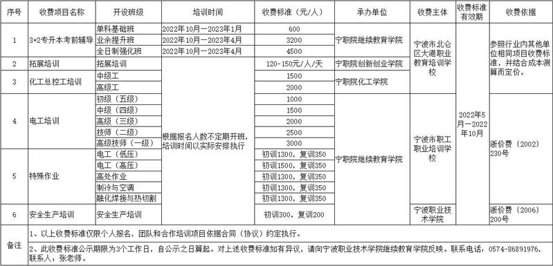 培训项目收费标准公示