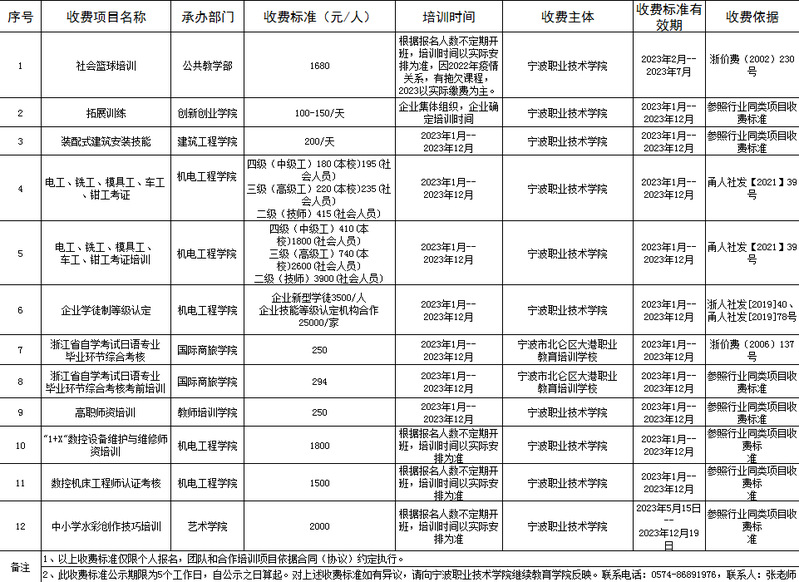 宁波职业技术学院继续教育学院培训项目收费公示表