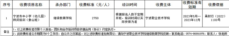 宁波职业技术学院继续教育培训项目收费公示表